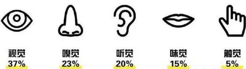 感官体验,一般是指人的五感,——“视觉”、“味觉”、“嗅觉”、“听觉”和“触觉”。据调查研究显示在五感中,感受最深刻的是视觉占到37%,其次是嗅觉占23%,听觉占20%、味觉占15%,最后才是触觉。